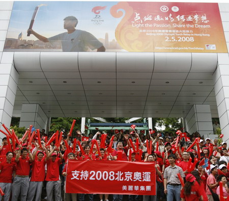 People cheer, wave flags as they wait to catch a glimpse of the Olympic flame as the Beijing Olympics 2008 torch is carried through Hong Kong May 2, 2008. [Agencies]