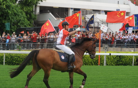 Hong Kong horseman carries the Olympic torch during the torch relay in HK May 2, 2008. [Xinhua]