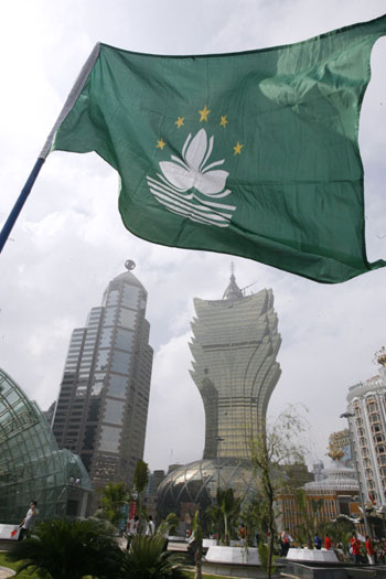 The flag of Macao SAR flutters in front of Bank of China building and Grand Lisboa during the 2008 Beijing Olympic torch relay in Macao May 3, 2008. [Agencies]
