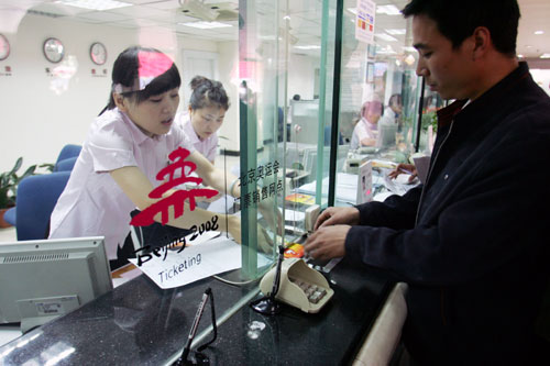 A local resident buys Olympic tickets at a Bank of China branch in Xi'an of Northwest China's Shaanxi Province May 5, 2008. The third round ticket sale based on "first come, first serve" kicked off on Monday, when more than 300,000 tickets were sold nationwide. [Xinhua]