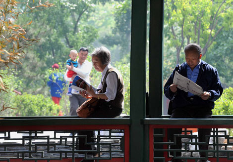 Two local residents sit inside an outdoor corridor, reading the newspaper, at a new eco-friendly park in Xuanwu district, Beijing, May 6, 2008. The new park was one of the district's eight parks that were constructed last March in an effort to address pollution for a Green Olympics. [Xinhua] |