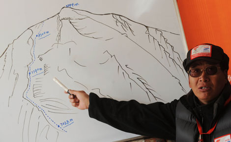 China mountaineering team spokesman Zhang Zhijian details on a diagram the proposed route for the Beijing Olympic torch's ascent of Mt. Qomolangma, also known as Mt. Everest, at the Mt. Qomolangma base camp, Southwest China's Tibet Autonomous Region, May 7, 2008. Beijing Olympic torch relay will be taken to the world's highest peak by the traditional climb route along the north slope, Xinhua citing Zhang as saying. [Xinhua]