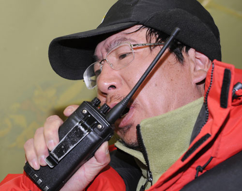 Li Zhixin, the commander-in-chief of the Beijing Olympic flame Qomolangma mountaineering team contacts with climbers carrying the flame en route to the summit from the base camp at the foot of the mountain May 8, 2008. The climbers started the final ascent from the camp at 8,300 meters of the mountain at 3:00 am on Thursday and are expected to reach the summit at around 10:00 am. [Xinhua]