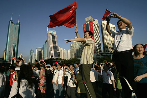 Onlookers greet an Olympic torch relay on a main street at Shenzhen in southern China's Guangdong province May 8, 2008. On the same day, the Olympic flame for the first time in history reached the top of the world, Mount Qomolangma at 8,844 meter. [Agencies]