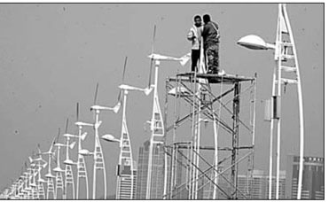 Workers checks street lamps powered by wind energy in the Olymic village in Qingdao, Shandong Province, which will host some of the water sports at this summer's Games. [File photo]