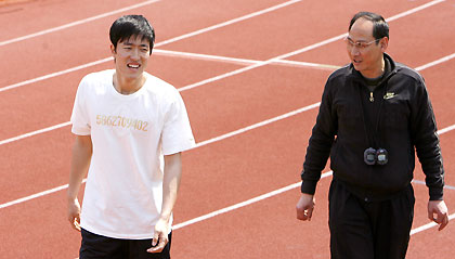 Liu Xiang(L) is at a training session with coach Sun Haiping in Shanghai in this March 26 file photo. [Xinhua]