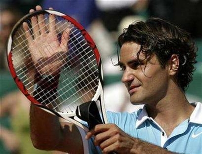 Roger Federer of Switzerland reacts after winning his match against David Nalbandian of Argentina in the Monte Carlo Masters Series tournament in Monaco, April 25, 2008. Federer hopes to celebrate his 27th birthday on August 8 by carrying the flag again for Switzerland at the opening ceremony of the Olympic Games. [Agencies]
