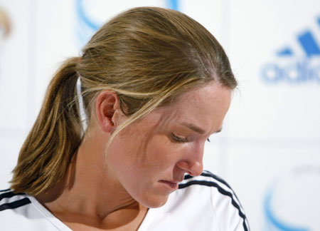 World number one Justine Henin reacts as she holds a news conference in Limelette, May 14, 2008. Henin announced her retirement from professional tennis. [Agencies]