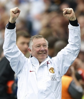 Manchester United manager Sir Alex Ferguson celebrates after winning the English Premier League folloowing his team's 2-0 win against Wigan in their English Premier League soccer match at The JJB Stadium, Wigan, England, Sunday May 11, 2008. Sebastian Coe, who is chairman of the 2012 organizing committee, would like to see Ferguson take charge of Britain's soccer team when London hosts the games. [Agencies]