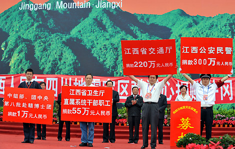 Local government organizations donate to earthquake-hit Sichuan Province at the openning ceremony of the Beijing Olympic torch relay in Jinggangshan, East China's Jiangxi Province, May 15, 2008. [Xinhua]
