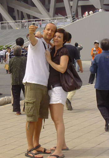 Two foreign spectators take photos of themselves with a cell phone in front of the National Olympic Stadium, also known as the Bird's Nest, before the Good Luck Beijing China Athletics Open, an Olympic test event in Beijing May 22, 2008. [chinadaily.com.cn]