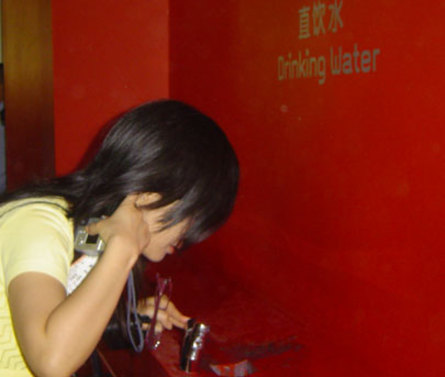 A spectator drinks from a water fountain in the National Olympic Stadium, also known as the Bird's Nest, during the Good Luck Beijing China Athletics Open, an Olympic test event in Beijing May 22, 2008. [chinadaily.com.cn]