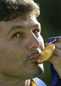 Australia's Michael Diamond kisses his gold medal after victory in the men's trap final at the Commonwealth Games shooting competition at the National Shooting Centre in Bisley in this July 31, 2002 file photo. [Agencies]
