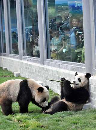Two giant pandas play inside its new enclosure at the Beijing Zoo May 24, 2008. Eight giant pandas selected by netizens to add cheer to the Beijing Olympics arrived at the zoo from their home in the earthquake devastated Sichuan province. [Agencies]