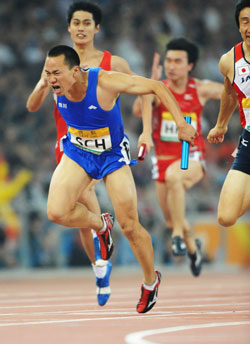 Yin Huanglong, an athlete from Sichuan Province, competes during the men's 400m relay at China Athletics Open, May 25, 2008. [Xinhua]