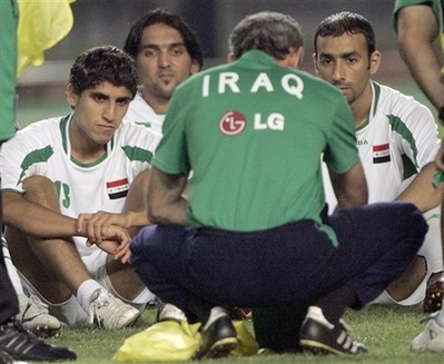 In this July 28, 2007 file photo, Iraqi soccer players gather for a team meeting with coaches during a practice session in Jakarta, Indonesia. FIFA has provisionally suspended Iraq from international soccer for one year due to a government decision to disband the sport's national organizing association. [Agencies]