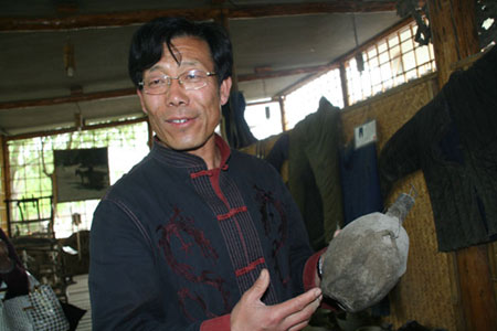 Yang Delu shows an old water pot made by tung oil (China wood oil) and paper in the Farm Tools Exhibition Hall in Xiaotangshan, Changping District, Beijing, April 24, 2008. [chinadaily.com.cn]