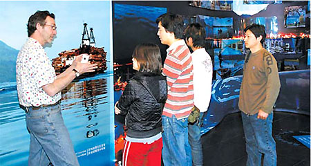 An official (left) from British Columbia, Canada tells Chinese visitors about the British Columbia Canada Pavilion in Beijing. [China Daily]