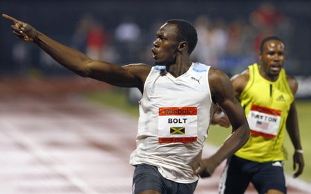 Usain Bolt of Jamaica celebrates setting a new world record in the men's 100 meters race next to Darvis Patton (R) of the U.S. at the Reebok Grand Prix athletics meet in New York, May 31, 2008. [Agencies]