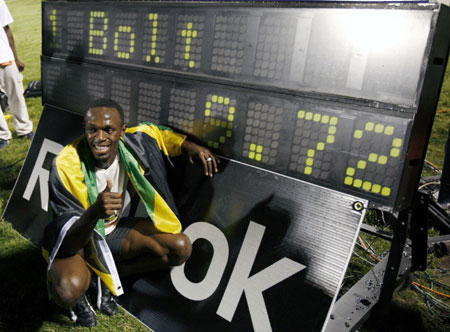 Usain Bolt of Jamaica celebrates next to the scoreboard after setting a new world record in the men's 100 meters race next at the Reebok Grand Prix athletics meet in New York, May 31, 2008. [Agencies]