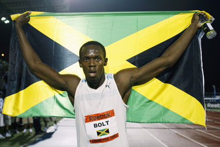 Usain Bolt of Jamaica celebrates after setting a new world record in the men's 100 meters race next at the Reebok Grand Prix athletics meet in New York, May 31, 2008. Bolt ran a tine of 9.72 seconds in the race. [Agencies]