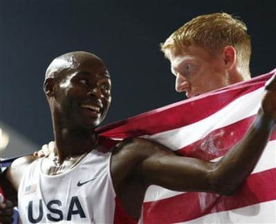 Bernard Lagat of the U.S. (L) celebrates with compatriot Matthew Tegenkamp after winning the men's 5000 metres final at the 11th IAAF World Athletics Championship in Osaka in this September 2, 2007 file photo. [Agencies]