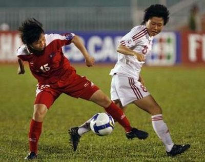 North Korea's Sonu Kyong-sun (L) and China's Xu Yuan fight for the ball during the AFC Women's Asian Cup 2008 final soccer match in Ho Chi Minh City June 8, 2008. [Agencies]