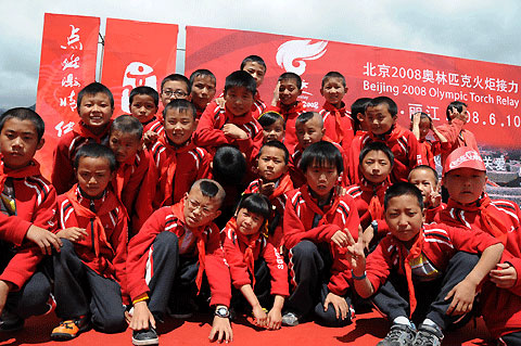 Children who moved from quake-hit Sichuan Province pose for a photograph during the torch relay in Lijiang, southwest Yunnan Province on June 10, 2008. [Xinhua]