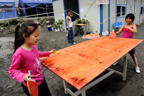 Two girls play table tennis beside temporary housing in Yingxiu County, the epicenter of last month's devastating earthquake in Southwest China's Sichuan Province, June 10, 2008. [Xinhua] |
