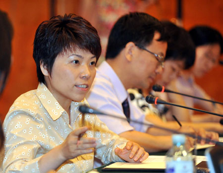 Former Olympic table tennis champion Deng Yaping in this June 10, 2008 photo, speaking about psychological counseling for earthquake survivors. [Xinhua] |