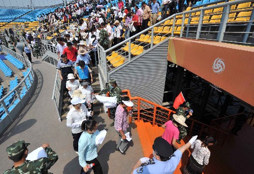 "Spectators" are evacuated from the beach volleyball venue in Chaoyang Park during an Olympic security drill in Beijing on Wednesday, June 11, 2008. [Xinhua]