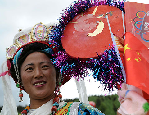 A local resident in ethnic dress in Shangri-La, southwest Yunnan Province welcomes the Olympic torch, June 11, 2008. The Yunnan leg of the relay completed yesterday and the torch now heads to Guizhou Province. [Xinhua]