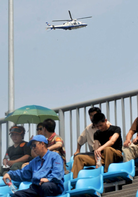 A helicopter patrols above the beach volleyball venue of the 2008 Beijing Olympic Games during an anti-terrorist exercise in at the Chaoyang Park Beijing, June 11, 2008. The "Great Wall No 5" rehearsal tested organizers' abilities to react to extreme situations including chemical attacks and hijackings of athletes. [Xinhua]