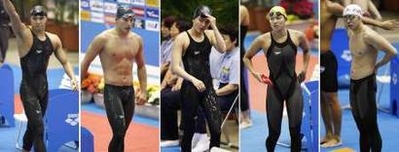 Japanese swimmers wearing Speedo's new LZR suit (L-R) Yoshihiro Okumura, Takeshi Matsuda, Reiko Nakamura, Haruka Ueda, and Kosuke Kitajima are seen in this combo photo at the Japan Open 2008 in Tokyo June 6, 2008. [Agencies] |