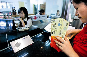 A woman receives her tickets for the 2008 Beijing Olympics at a Bank of China outlet in Beijing in this file photo. [Xinhua]