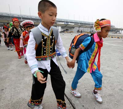 Little ambassadors for China's 56 nationalities arrive in Beijing June 18, 2008. These boys and girls will enjoy the promising improvement brought by the upcoming Olympics during the five-day event. [Xinhua]
