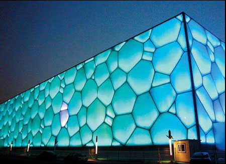 Beijing's new Olympic swimming center shines at night. [China Daily] |