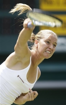 Slovakia's Dominika Cibulkova serves to China's Jie Zheng, during their first round singles match at Wimbledon, Monday, June 23, 2008. [Agencies]