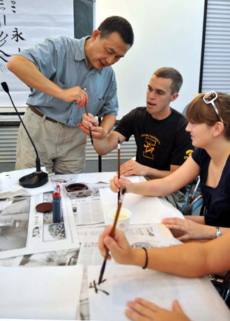 Gao Yuan (L), a Chinese calligraphy teacher, instructs two overseas Olympic volunteers how to hold their brushes in Beijing, June 24, 2008. Twenty-four students from the University of Iowa in the United States, who will serve as Olympic media volunteers in August, started their week-long orientation course on Chinese culture, environment, economy, media and ethnic minorities at Tsinghua University as of Monday. [Xinhua]