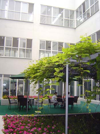 An open-air courtyard in the middle of the ward building of the international medical department of China-Japan Friendship Hospital is seen in this picture June 25, 2008. [chinadaily.com.cn]