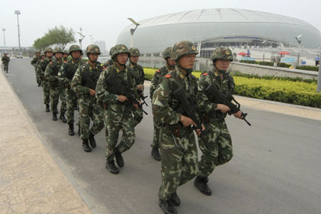 Chinese armed police take part in an anti-terrorism drill outside the Tianjin Olympic Stadium in Tianjin municipality June 25, 2008. The stadium will host the preliminary soccer competition during the 2008 Beijing Olympic Games. [Agencies]
