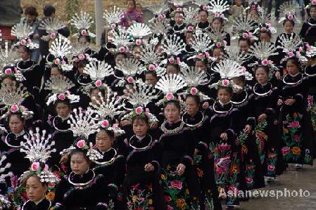 Dancers of the Miao ethnic group perform to the drum beat in Guizhou in this March 29, 2008 file photo. They, together with 25 other folk dance groups, were recently selected to perform prior to the opening ceremony of the 2008 Beijing Olympic Games in August. [Asianewsphoto]