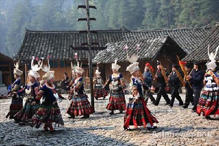 Dancers of the Miao ethnic group perform to the drum beat in Guizhou in this March 29, 2008 file photo. They, together with 25 other folk dance groups, were recently selected to perform prior to the opening ceremony of the 2008 Beijing Olympic Games in August. [Asianewsphoto]