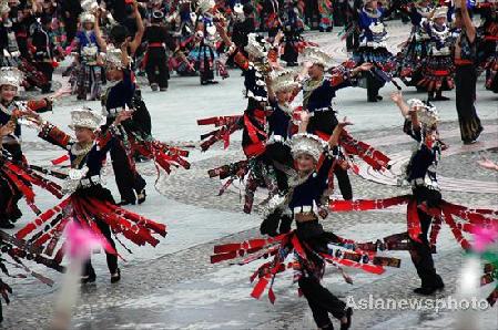 Dancers of the Miao ethnic group perform to the drum beat in Guizhou in this March 29, 2008 file photo. They, together with 25 other folk dance groups, were recently selected to perform prior to the opening ceremony of the 2008 Beijing Olympic Games in August. [Asianewsphoto]