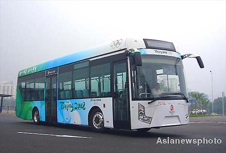An Olympic environmentally-friendly coach runs during a test in the Olympic bus park lot near the north section of the Fourth Ring Road in Beijing June 26, 2008. 50 coaches of this kind will drive athletes and media staff between the Olympic Village and venues. [asianewsphoto]