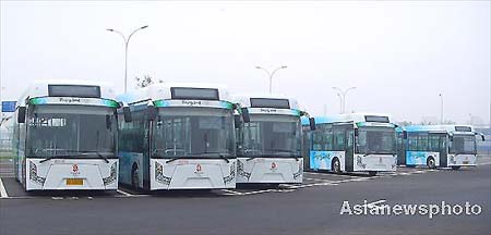 Olympic environmentally-friendly coaches are parked in the Olympic bus park lot near the north section of the Fourth Ring Road in Beijing June 26, 2008. 50 coaches of this kind will drive athletes and media staff between the Olympic Village and venues. [asianewsphoto]