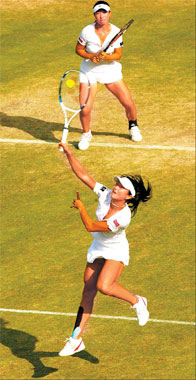 Chinese pair Yan Zi (front) and Zheng Jie play against Russia's Elena Vesnina and Vera Zvonareva during their 2008 Wimbledon championships doubles match at the All England Club in southwest London, on Saturday. The Chinese won 6-3, 6-2 to advance into the last 16. [Agencies]