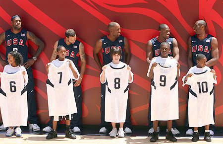 Members of the US men's Olympic basketball team (2nd row, L to R) LeBron James, Deron Williams, Jason Kidd, Dwyane Wade and Kobe Bryant, in their official uniforms, pose with basketball fans during a team promotional event at Rockefeller Center in New York, June 30, 2008. [Xinhua] Track and Field Team Uniforms