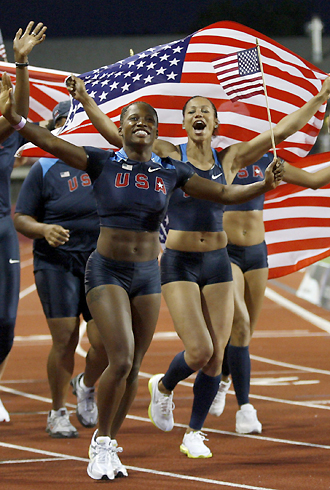 Sprinter Lauryn Williams and heptathlete Hyleas Fountain model the uniforms they will wear at the Beijing Olympics after they were unveiled at the U.S. Olympic Track and Field Trials in Eugene, Oregon June 30, 2008. [Agencies] Basketball Uniforms