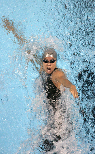 Natalie Coughlin swims to win her preliminary heat of the Women's 100m Backstroke setting a new world record time of 59.03 at the US Olympic Swimming Trials in Omaha, Nebraska, June 30, 2008. This photograph has been rotated 90 degrees anti-clockwise. [Agencies]
